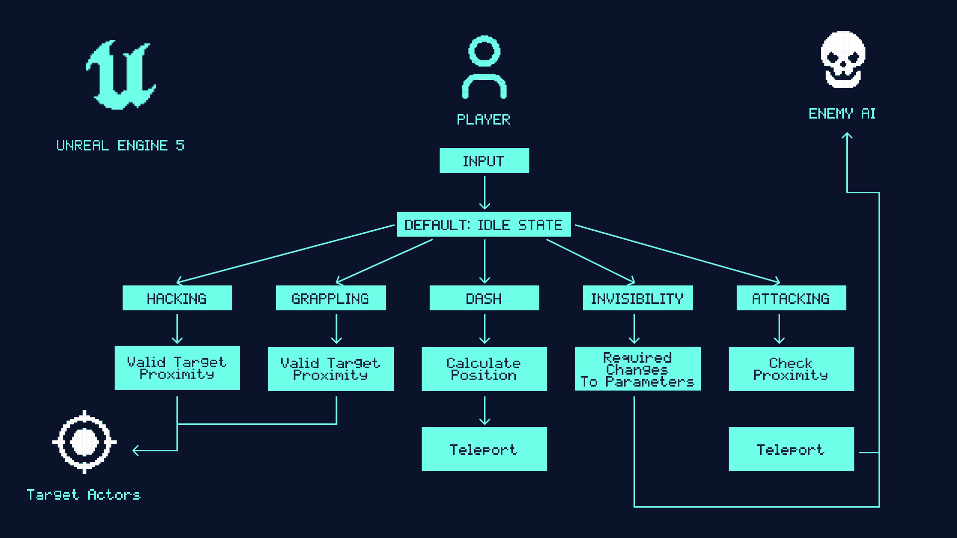 Designed the state machine system that handled transitions between gameplay states such as Idle, Dash, Grapple, Invisibility, Hacking, and Assassination.